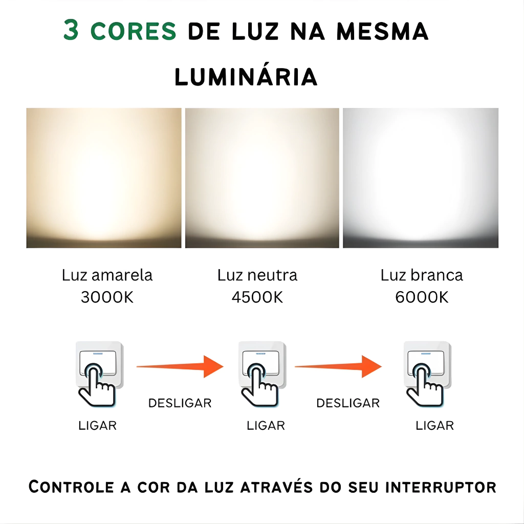 Cor da luz: Branco Frio (6000k), Branco Neutro (4000k) e Branco Quente (3000k)